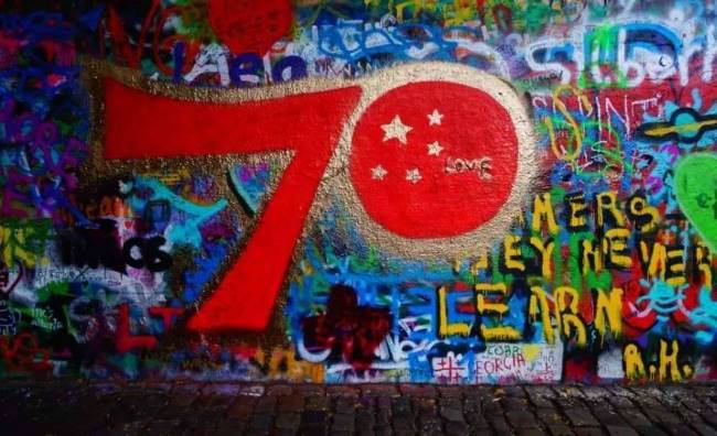 图二、中人民共和国建政70周年前夕,捷克首都布拉格市的列侬墙原址被中国“爱国人士”绘上了具有中国特色的红色标记。(图片来源于网络)