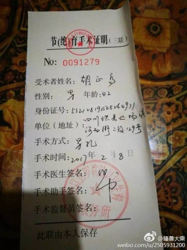 请大家好好反思:你们生两个儿子, 长大后当兵, 保家卫国, 是件好事善事, 但是, 为什么一生下来就是犯罪了呢?为什么? 古今中外没有这样的恶法!在奴隶社会, 奴隶是有自由生娃的权利。 中国男人自己的老婆, 被中共计生官员在她的子宫里安装一个金属异物和收费站, 你们男子汉大丈夫都不敢吭一声! 有的男人们还要献身, 让共产党政府把自己给阉割了, 变成了一名”育残”的残疾人了。 根据国外法律, 妇女被结扎、男人被阉割的, 叫做育残, 属于国家二级伤残。妇女子宫被强制带环的, 叫做持续性性侵犯, 属于性虐待犯罪行为。 目前, 中国有近十亿人, 已经被中共搞成二级残疾人、性侵犯受害者。