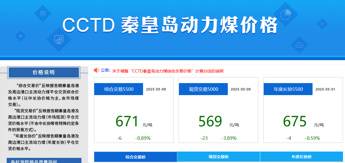 到2025年5月9日秦皇岛港5500大卡动力煤现货价格继续跌到每吨671元,跌势还在持续之中。