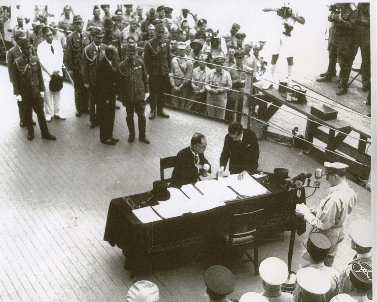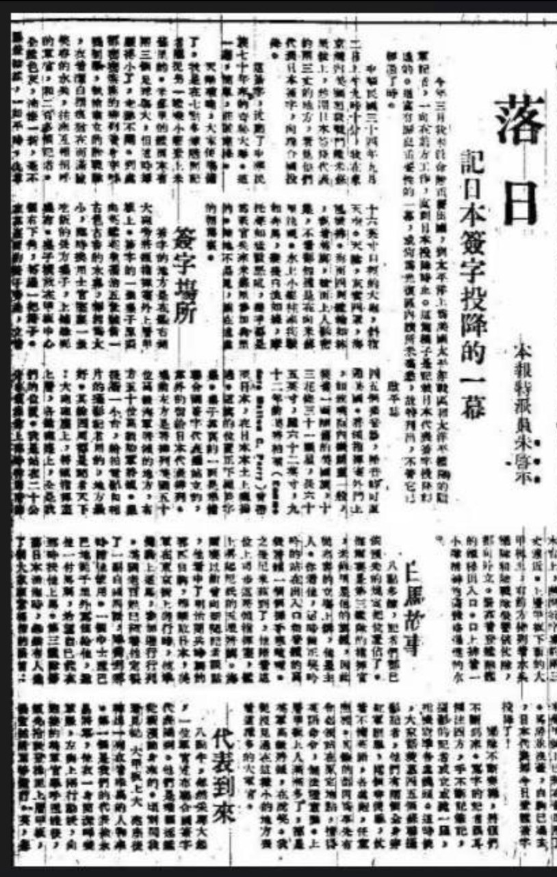1945年9月2日上午,在停泊于日本东京湾的美国“密苏里”号战舰上,举行了日本向盟军投降的签字仪式。香港《大公报》记者朱启平先生现场采访了这一重大历史事件,并撰写了题为《落日》的通讯稿。